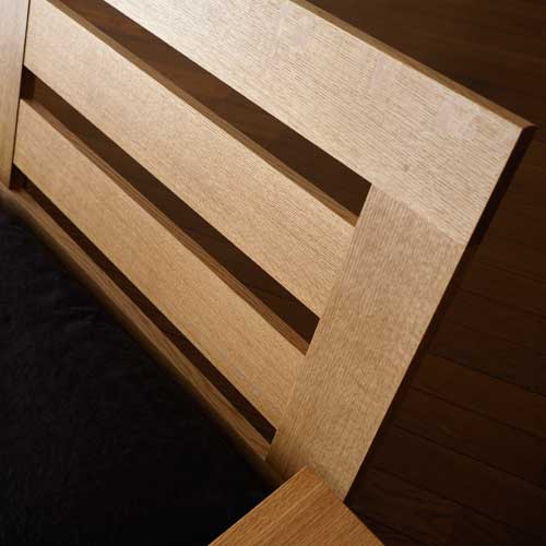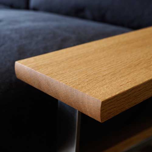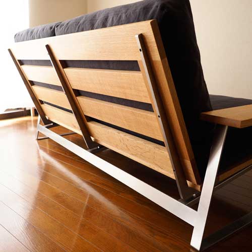 ミナトソファーの背板にはナラの無垢材を使い、支柱としてステンレスを組み合わせています。表も裏もちゃんと仕上げてあります。そして背のクッションなしでも使えるよう設計しました。夏にはより涼しげな感じで使えます。また座面の奥行きが増すのであぐらをかいて座ったりと使い勝手も広がります。
