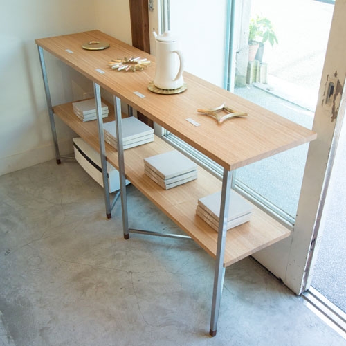 シンプルなテーブル、作業台、展示台に。写真はタモ材です。オプションの棚板があります。ウォールナット材、カバ集成材でもお作りします。基本の天板サイズは70×150cmになります。