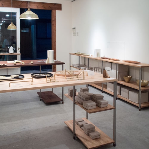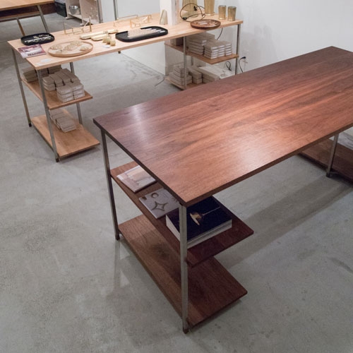 そこで脚と天板をそれぞれ基本パーツにして色々と変化することができる家具というものにたどり着きました。ベースの構造は一組の脚パーツ。それに幅、長さの違う天板を組み合わせることで作業机、デスク、オープンラック、ディスプレイ棚・・と変化していきます。