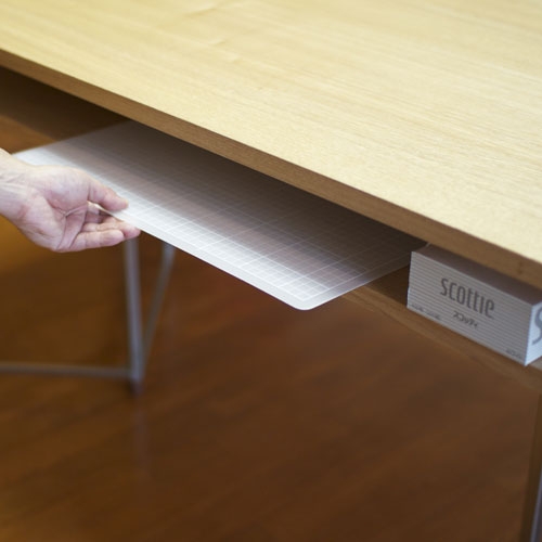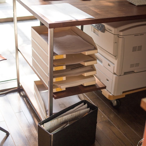 TanaAshiには左の写真のようにオプションの棚板を付けることができます。ここにファイルケースや収納箱などを自由にレイアウトできます。また特徴がひとつあります。手前側に支柱がないので、デスクに向かって座った状態で棚上のファイルなどに手を伸ばしたとき、さえぎるものがなく取りやすいのです。